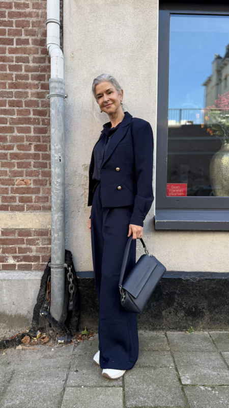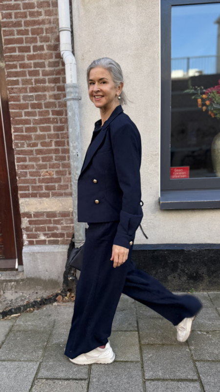 Prachtig pak met kort jasje en wijde pantalon. Mooie wat zwaardere kwaliteit stof. Valt mooi en op maat.