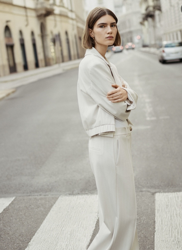 Kort jasje, bomberjacket, gecombineerd met een mooie wijdvallende pantalon. Voor een nieuwe look.