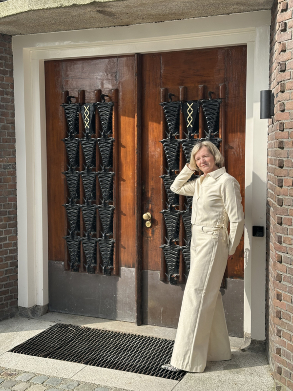 Trendy pak, met kort jasje, wijde pantalon, klein glittertje en veters als detail aan de zijkanten.