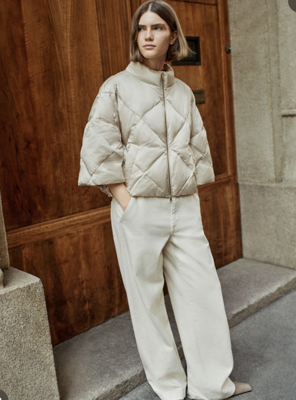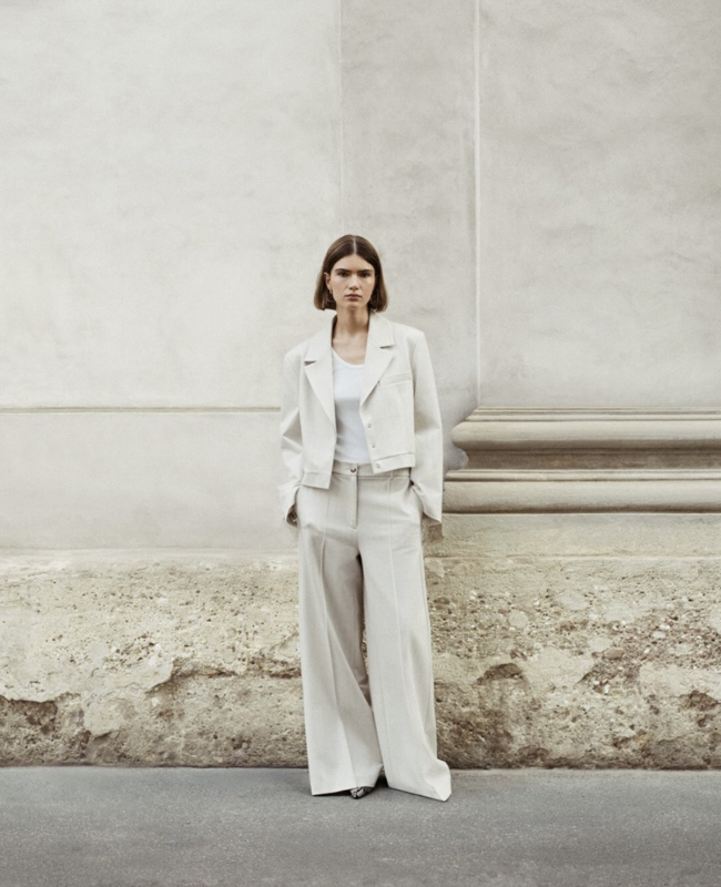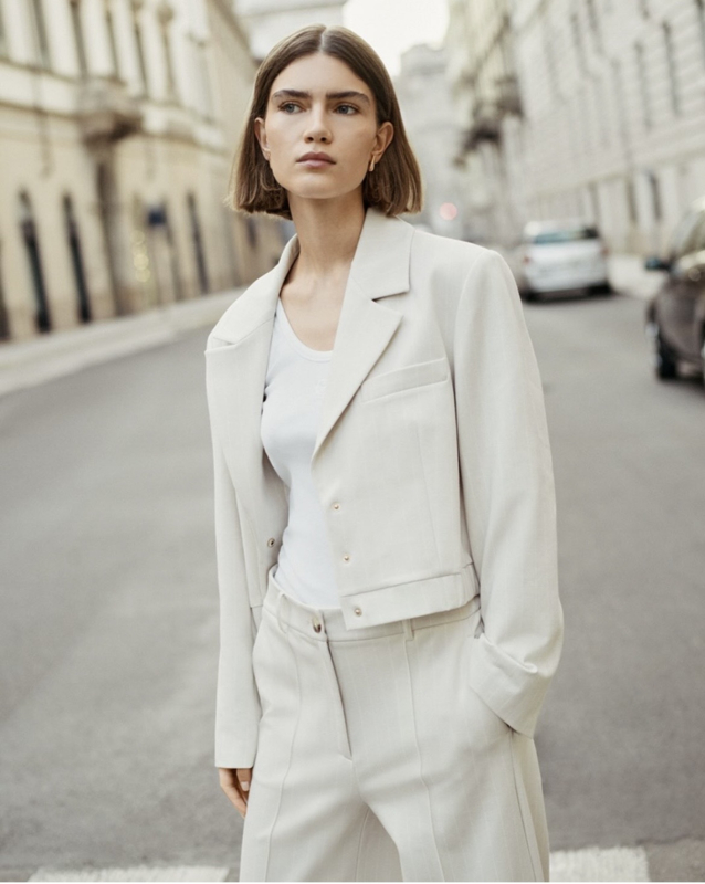 Beaumont, licht pak met krijtstreep, kort colbertKort jasje, bomberjacket, gecombineerd met een mooie wijdvallende pantalon. Voor een nieuwe look.